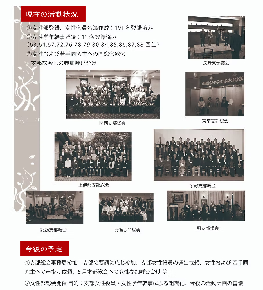 同窓会の運営にもこれまで以上に女性会員に携わっていただくことを目的として「女性部」を発足し、同窓会への女性会員の参加を呼びかけていく。